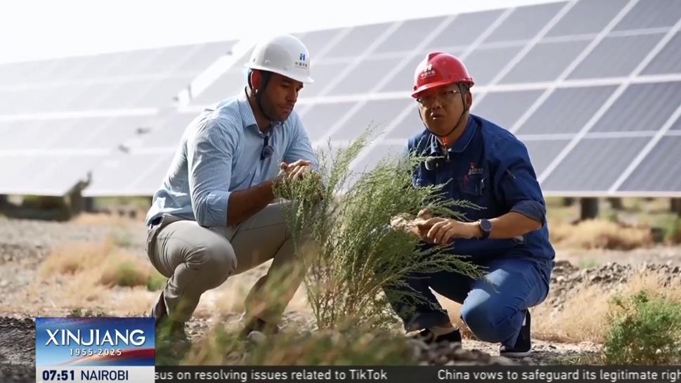 外籍主持人林肯探訪了全球最大的“草光互補”光伏基地——阿合雅光伏產業(yè)園。這片由181萬塊光伏板組成的藍色海洋,占地493公頃,相當于700個標準足球場。不僅能夠提供滿足約43萬人全年用電需求,還兼具治沙功效。中國華能集團烏什光伏電站負責人周博表示,這類光伏設施能夠穩(wěn)固土壤、防止侵蝕,板面凝結的水珠還可灌溉下方土地,支持植物持續(xù)生長?!案瓯谄孥E”的背后,是國家實現(xiàn)“雙碳”目標而推動的生態(tài)與能源的“雙向奔赴”。