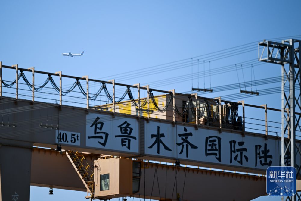 ↑9月15日,一架飛機(jī)從烏魯木齊國際陸港區(qū)上空飛過。