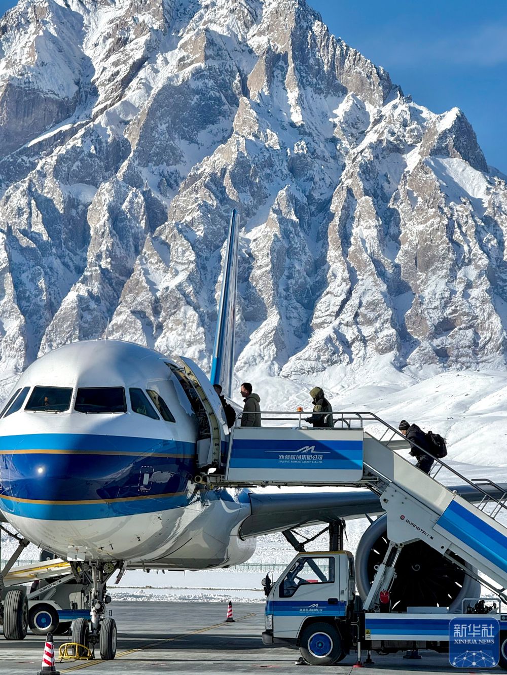 ↑1月13日,旅客在塔什庫爾干紅其拉甫機(jī)場準(zhǔn)備登機(jī)。