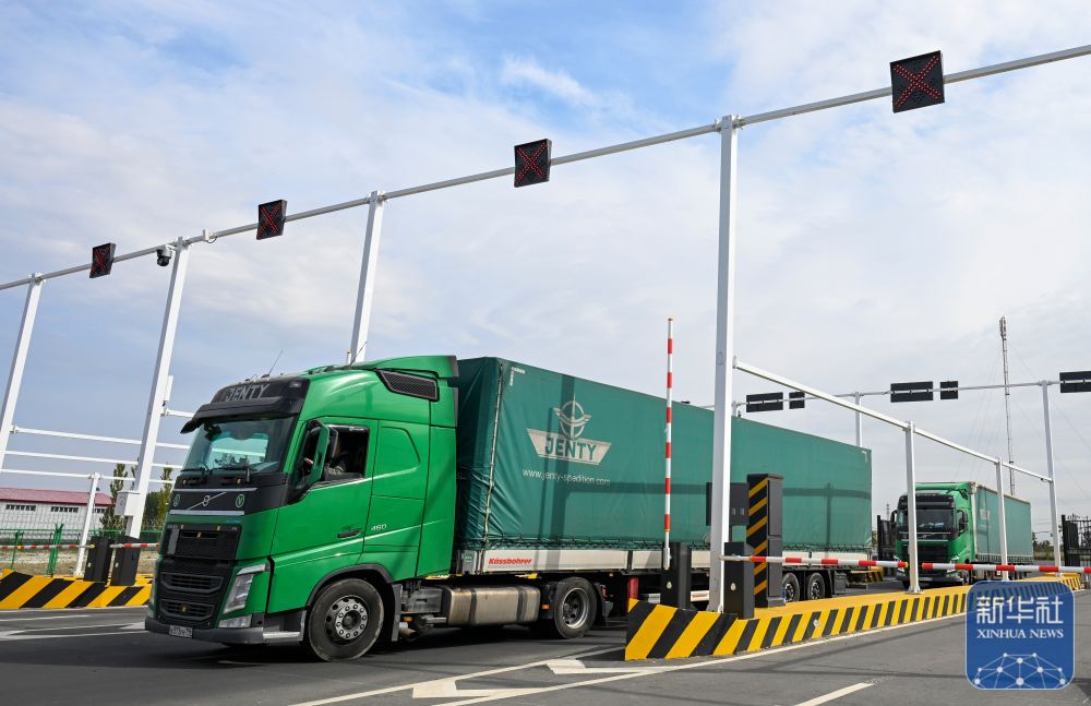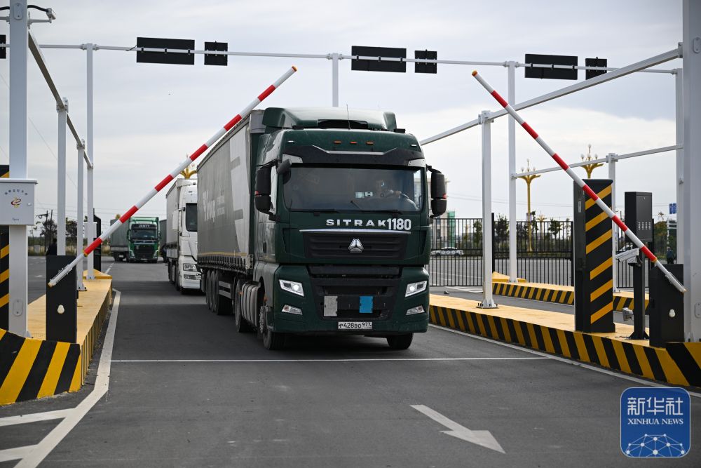 ↑9月17日,來自俄羅斯的貨車從位于新疆塔城地區(qū)的巴克圖口岸海關(guān)集中查驗(yàn)場地出關(guān)。