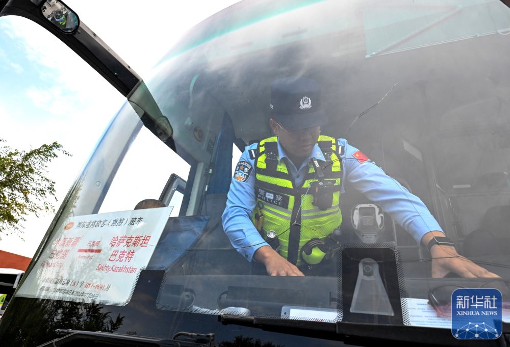 ↑9月17日,巴克圖出入境邊防檢查站的移民管理警察在巴克圖口岸查驗(yàn)經(jīng)由該口岸出境前往哈薩克斯坦的客車。