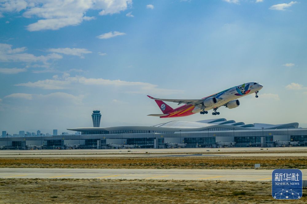 ↑9月15日,一架飛機(jī)從烏魯木齊天山國際機(jī)場起飛。