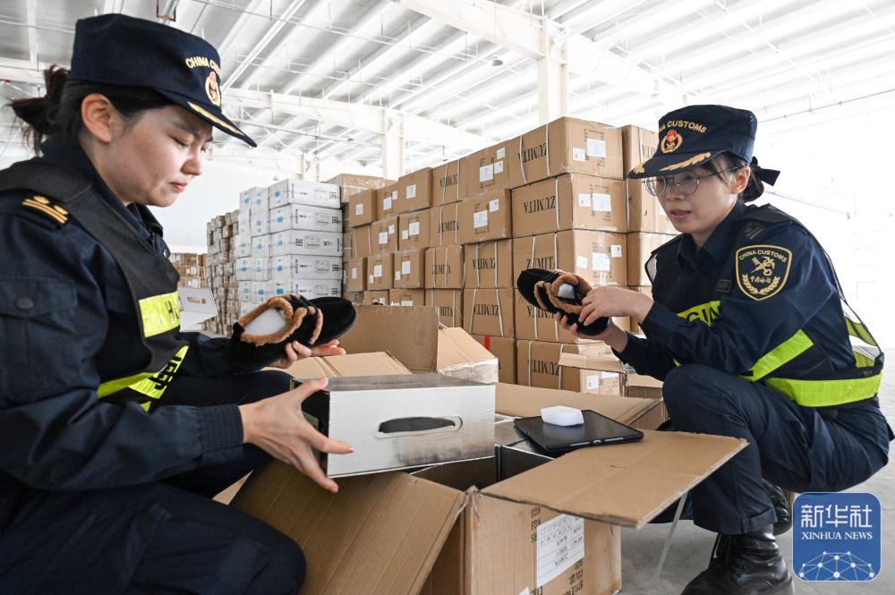 ↑9月17日,新疆塔城海關(guān)工作人員在巴克圖口岸集中查驗(yàn)區(qū)檢查一批經(jīng)由該口岸運(yùn)往哈薩克斯坦的鞋品。