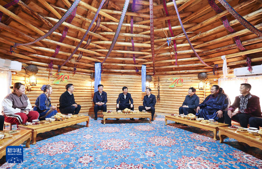 9月27日,受習近平總書記囑托,中共中央政治局常委、全國政協(xié)主席、中央代表團團長王滬寧帶領中央代表團部分成員到阿勒泰地區(qū)布爾津縣考察。這是王滬寧和中央代表團部分成員在扎拉特鄉(xiāng)村旅游專業(yè)合作社同村民交流。新華社記者 姚大偉 攝