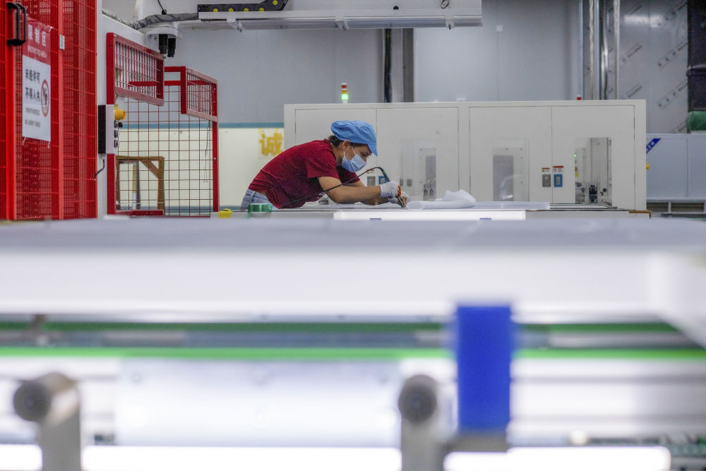 9月22日,工人在新疆巴音郭楞蒙古自治州若羌縣的國晟企誠新能源有限公司對光伏電池片進(jìn)行疊層返修。