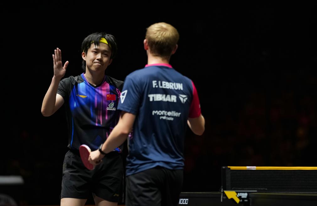 10月5日,王楚欽(左)賽后和勒布倫致意。新華社記者 孫非 攝