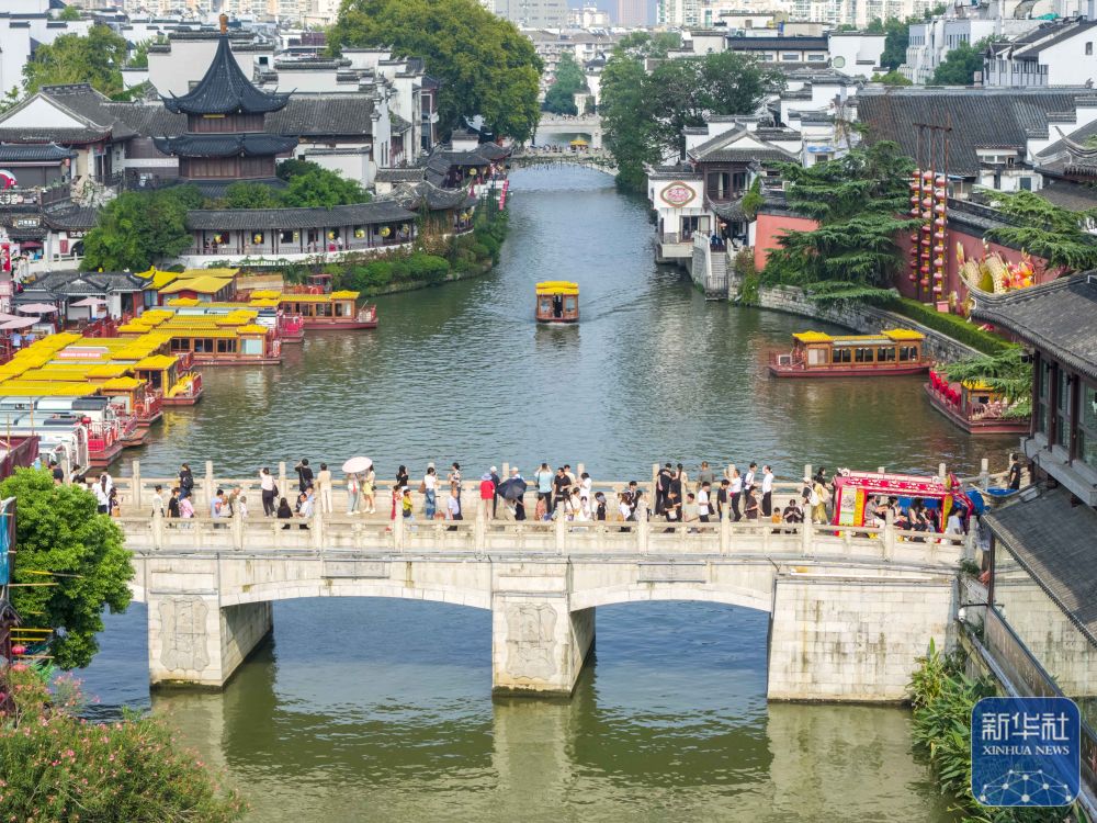 ↑ 10月5日,人們在南京夫子廟景區(qū)游玩(無人機照片)。新華社發(fā)(史俊攝)