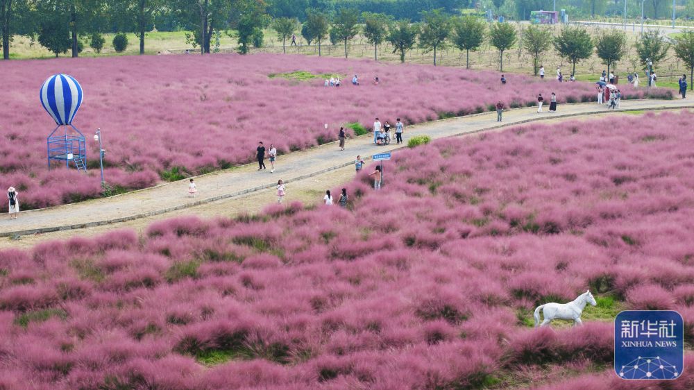 ↑ 10月5日,人們在南京八卦洲陌上花渡游玩(無人機照片)。新華社發(fā)(蘇陽攝)