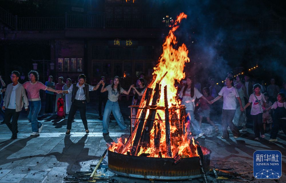 ↑ 10月5日晚,在貴州省晴隆縣阿妹戚托小鎮(zhèn),游客與當(dāng)?shù)厝罕妵艋鸸参?。新華社記者 楊文斌 攝