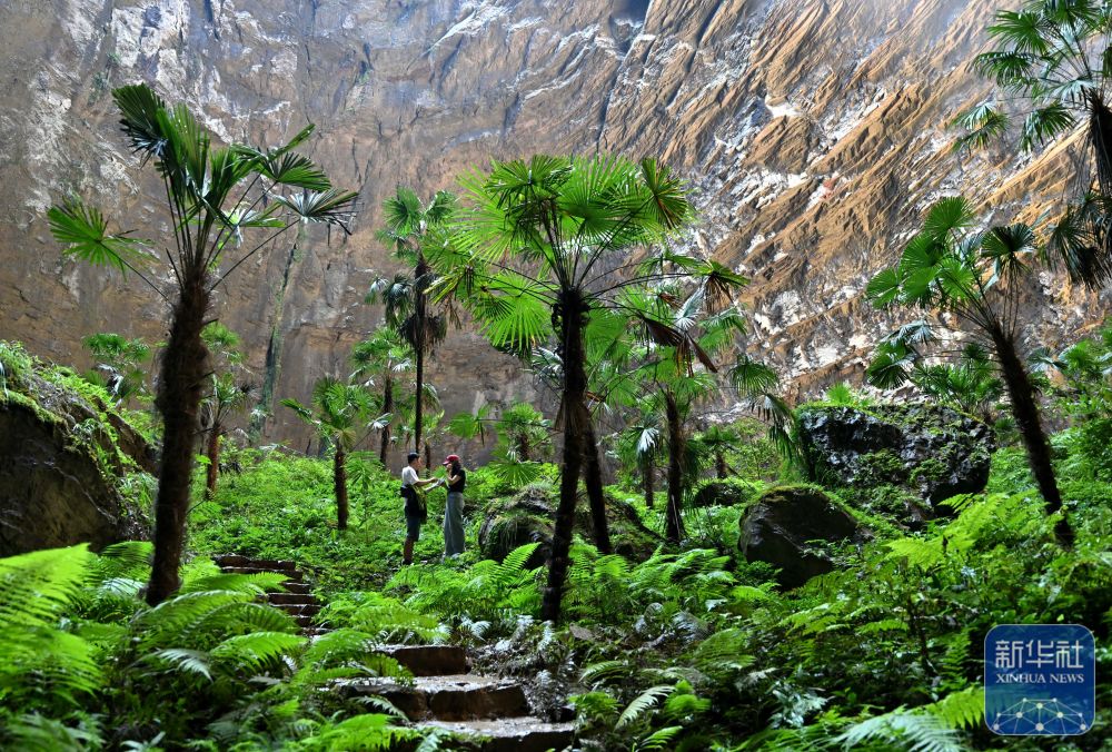 ↑ 10月6日,游客在湖北省宣恩縣矅天眼景區(qū)深達290余米的鑼圈巖天坑底部觀光游玩。新華社發(fā)(宋文攝)