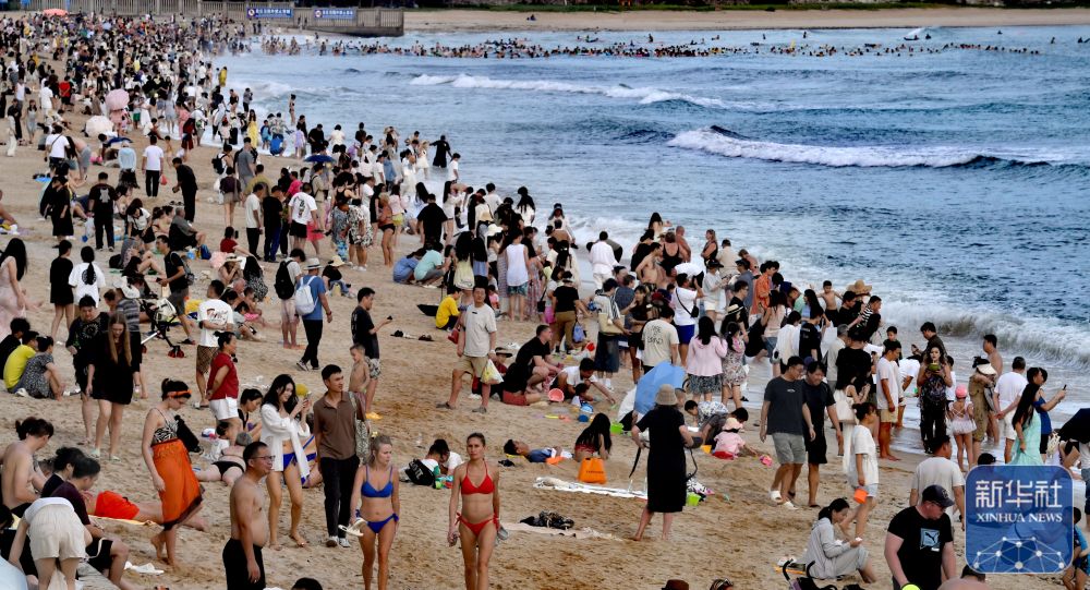 ↑ 10月6日,在海南省三亞市大東海景區(qū),市民和游客在海灘戲水。新華社記者 趙穎全 攝
