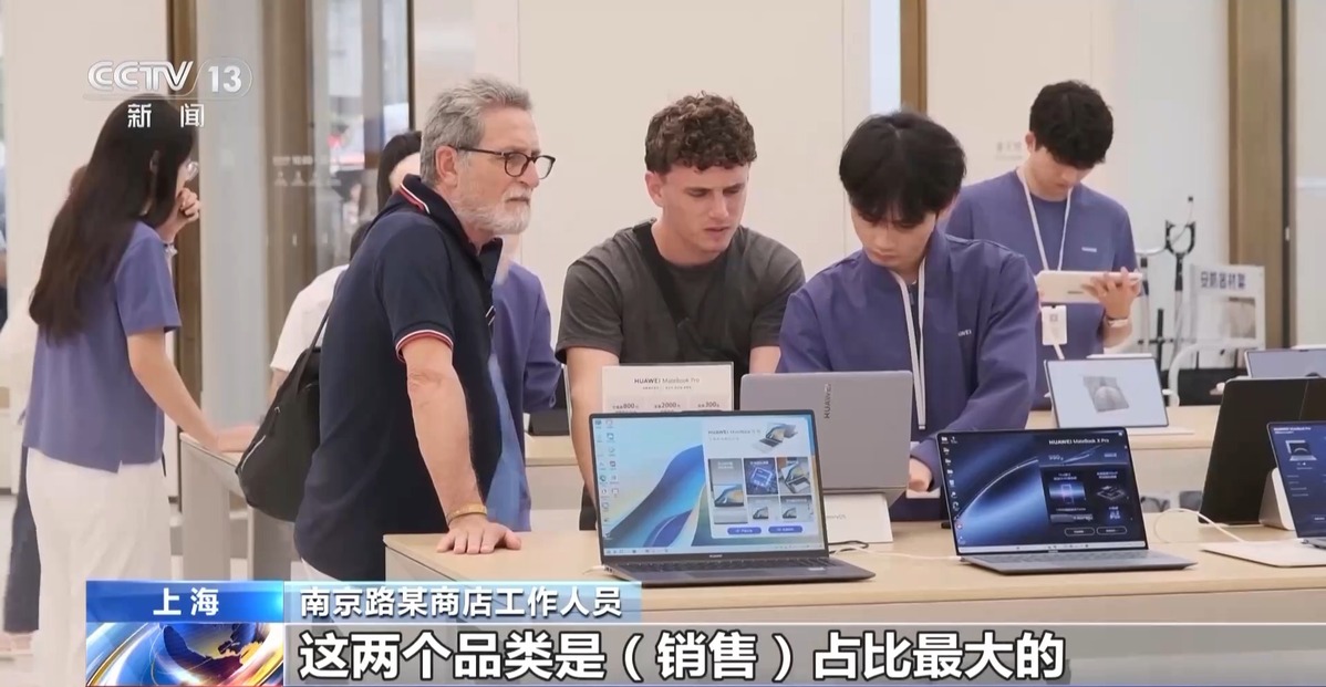 南京路某商店工作人員:外國顧客特別喜歡音頻類和智能手表類產(chǎn)品,這兩個(gè)品類是銷售占比最大的。