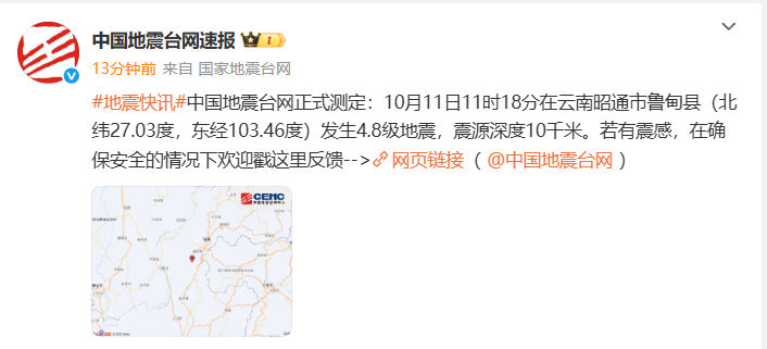 中國地震臺網(wǎng)正式測定:10月11日11時(shí)18分在云南昭通市魯?shù)榭h(北緯27.03度,東經(jīng)103.46度)發(fā)生4.8級地震,震源深度10千米。