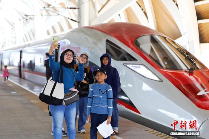當(dāng)?shù)貢r間6月26日,旅客在印尼雅加達(dá)哈利姆高鐵站與列車合影。雅萬高鐵由中印尼兩國合作建設(shè),最高運(yùn)營時速350公里。 中新社記者 李志全 攝