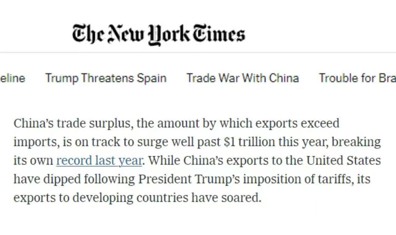 美國《紐約時報》的文章分析稱,強勁的出口和對新工廠的持續(xù)投資使中國經濟在夏季保持穩(wěn)定增長。中國的出口投資以及用國產商品取代進口的政策繼續(xù)推動著經濟增長。與去年同期相比,商品貿易順差在過去三個月中增加了12.4%。中國的貿易順差今年有望超過1萬億美元,主要得益于中國對發(fā)展中國家的出口激增。