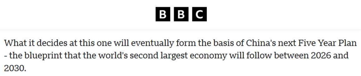 10月20日至23日,黨的二十屆四中全會在北京舉行。對此,英國廣播公司(BBC)19日報道認為,“此次會議所作的決定最終將成為中國下一個五年規(guī)劃的基礎,而這一規(guī)劃將指引世界第二大經濟體在2026年至2030年期間的發(fā)展方向”。