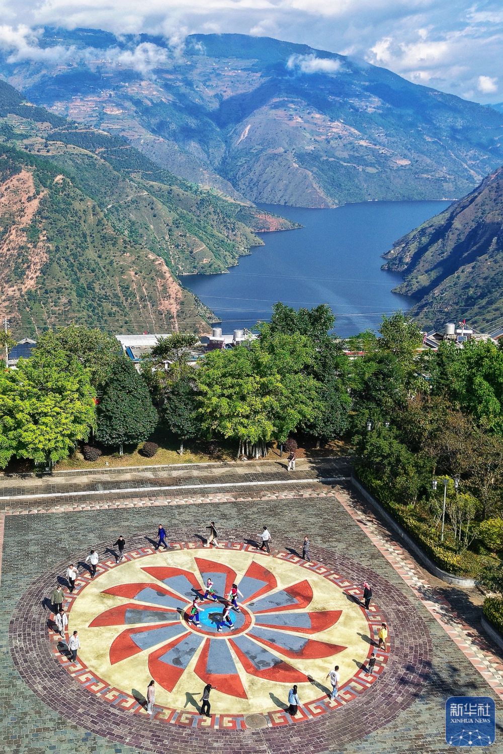 ↑ 10月31日,小灣東鎮(zhèn)居民在瀾滄江畔的移民廣場休閑(無人機照片)。