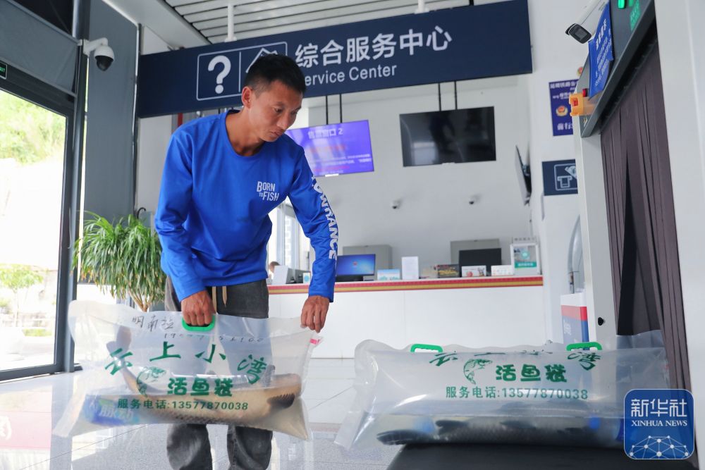 ↑ 10月31日,工作人員將裝袋、加氧后的小灣東鎮(zhèn)生態(tài)江魚放上安檢設備,準備通過高鐵動車運往昆明。