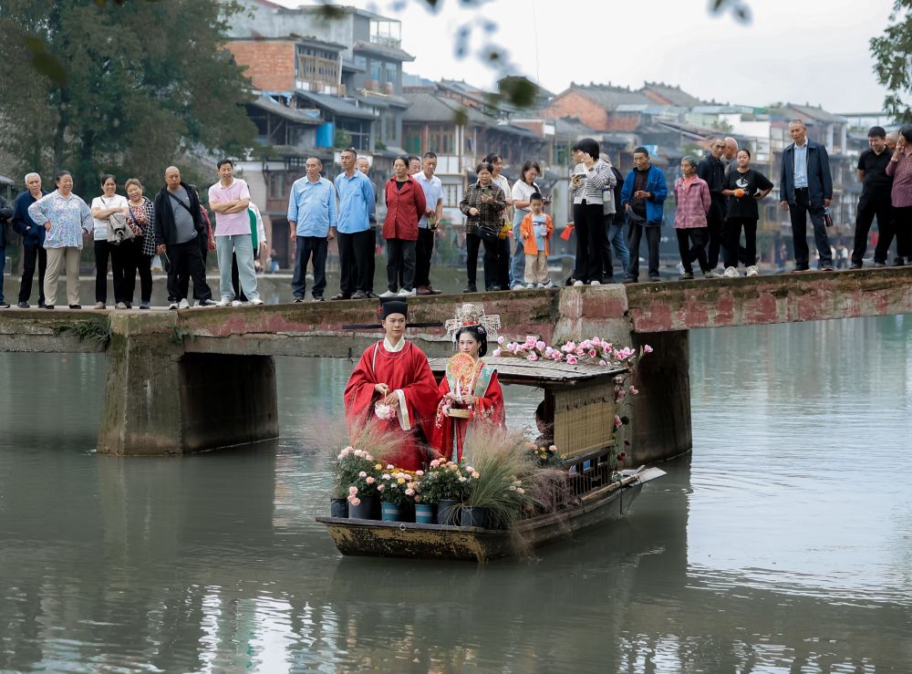 國(guó)慶節(jié)期間,成都邛崍市夾關(guān)古鎮(zhèn)舉行的水上婚禮儀式。(受訪單位供圖)