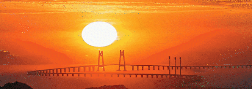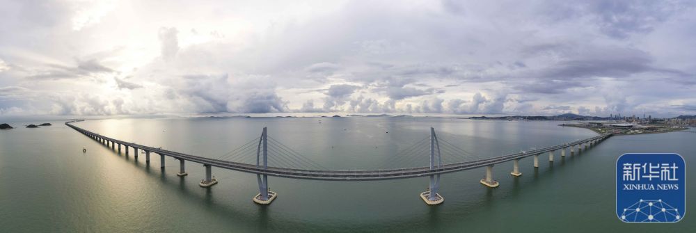 港珠澳大橋上,晨光灑在車流之上。
