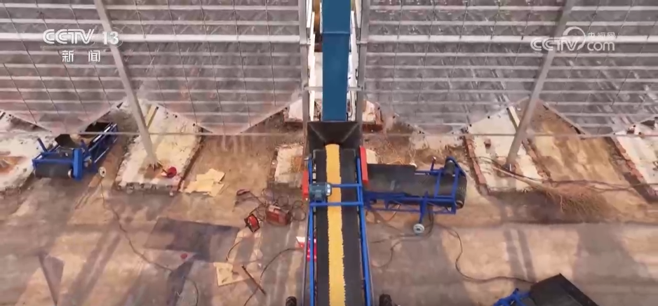 烘干后的玉米去哪里了?大家抬頭看,答案在樓頂上這些高速傳送帶,玉米通過傳送帶進入下一個加工區(qū)。