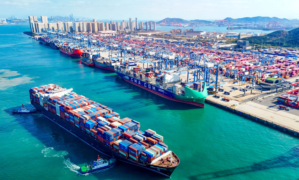 一艘貨輪滿載貨物駛出青島自貿片區(qū)(2025年11月5日攝,無人機照片)。新華社發(fā)(張進剛攝)