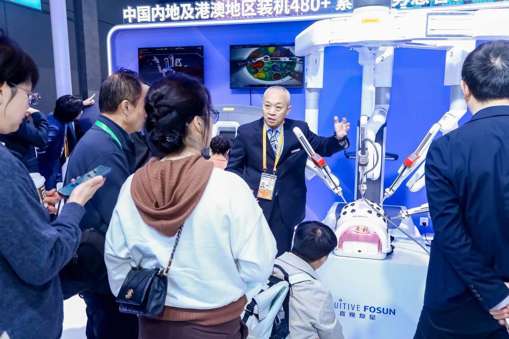 手術(shù)機(jī)器人是各家跨國醫(yī)療行業(yè)企業(yè)展示數(shù)智創(chuàng)新、產(chǎn)業(yè)協(xié)作的重頭戲。作為每年醫(yī)療展區(qū)的“明星展品”,八赴進(jìn)博的達(dá)芬奇手術(shù)機(jī)器人今年首次集齊“全家?!?。