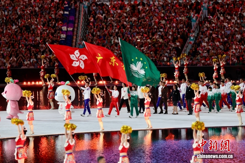 11月9日晚,第十五屆全國運(yùn)動會開幕式在廣東奧林匹克體育中心舉行。圖為東道主廣東、香港、澳門體育代表團(tuán)同時(shí)入場。中新社記者 富田 攝