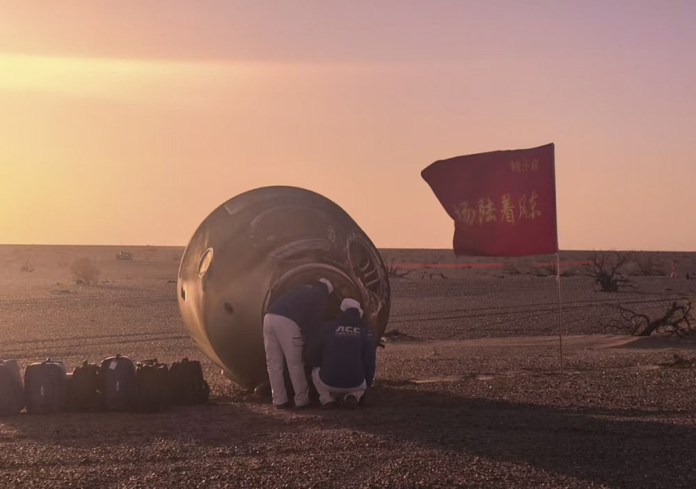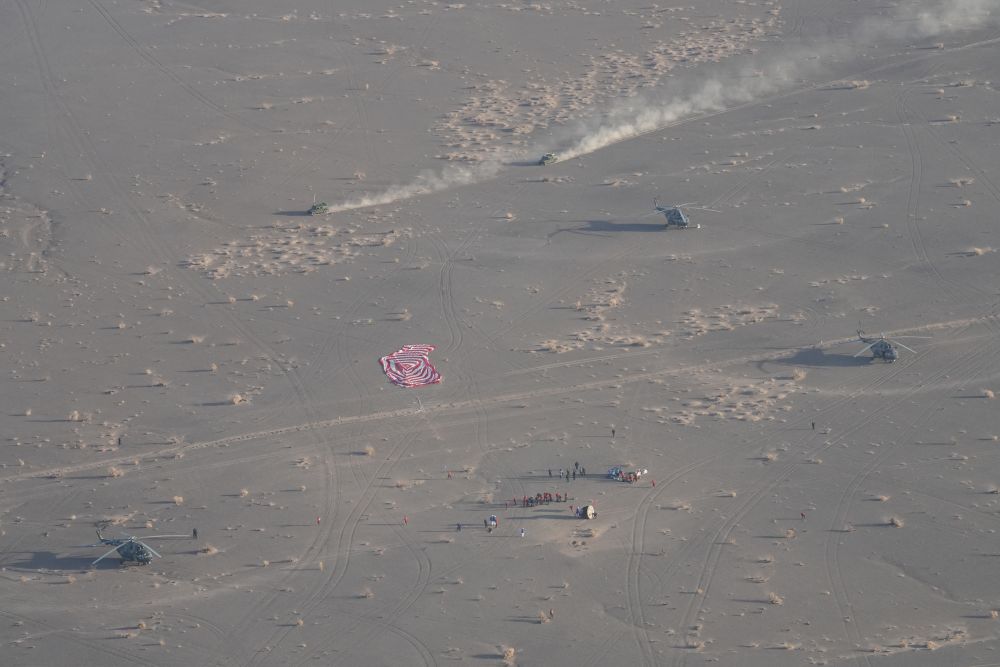 14日下午,返回艙主傘打開(kāi)瞬間,酒泉衛(wèi)星發(fā)射中心李斌斌已鎖定跟蹤,實(shí)時(shí)畫面?zhèn)飨蛑缚卮髲d??罩蟹株?duì)、地面分隊(duì)等向落點(diǎn)集結(jié),共同搭建起“空地一體、立體協(xié)同”多維搜救體系。