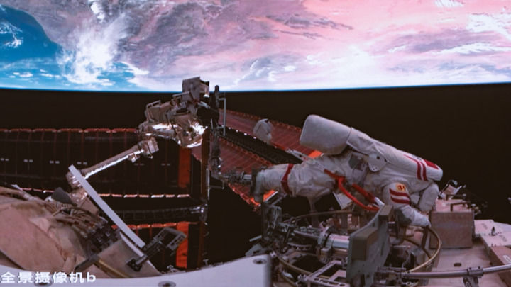 這是9月25日晚在北京航天飛行控制中心屏幕上拍攝的神舟二十號(hào)乘組航天員王杰在空間站組合體艙外作業(yè)的畫面。新華社記者李明剛 攝
