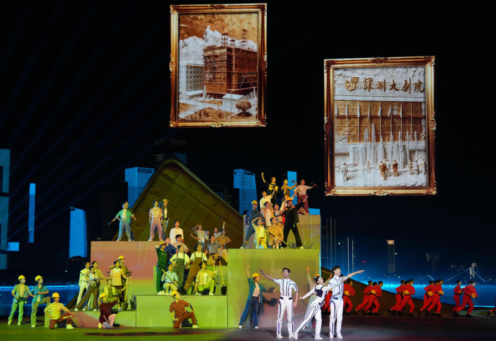 舞臺(tái)上,象征改革開(kāi)放歷程的建設(shè)者們接力登場(chǎng),劈山跨海,筑路架橋。他們帶著夢(mèng)想南下,以敢闖敢試、敢為人先、埋頭苦干的特區(qū)精神,闖出一片新天地。
