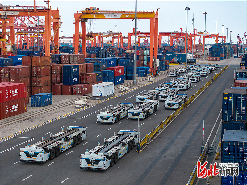 近日,唐山港京唐港區(qū),集裝箱碼頭堆場上智能平板運(yùn)輸車整裝待發(fā)。 河北日報(bào)記者趙杰攝