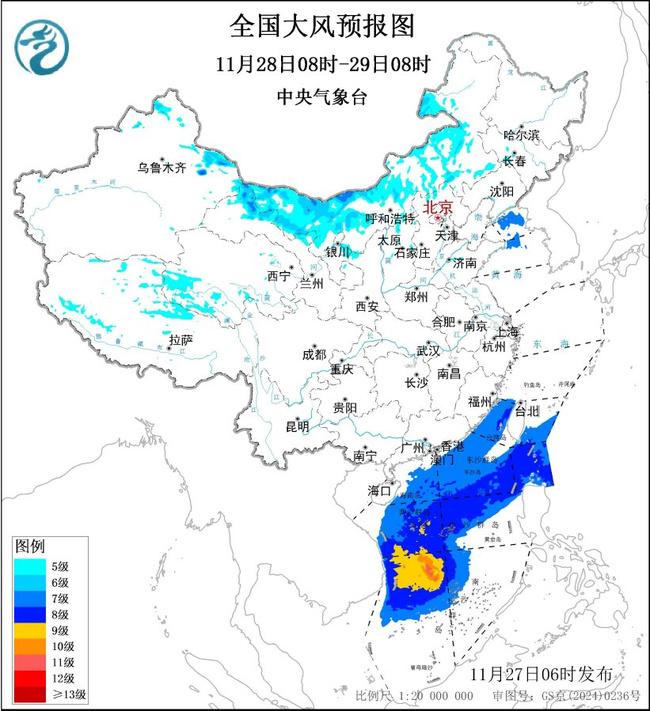 11月28日08時至29日08時,新疆北部和東部、內蒙古大部、甘肅北部、寧夏北部、山西北部以及青海南部、西藏北部等地有5~6級大風,陣風7~8級,其中新疆東部山口地區(qū)、內蒙古中西部部分地區(qū)風力可達7級,陣風8~9級;11月28日08時至29日08時巴士海峽、南海東北部和中部海域將有8級、陣風9級的東北風,其中南海西南部海域的風力可達9級、陣風10級。