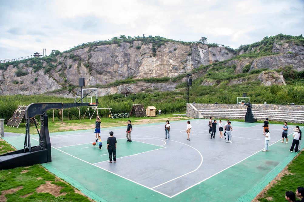 2025年8月16日,在重慶市北碚區(qū)靜觀鎮(zhèn)中華村,游客在礦坑修復(fù)改造的運動場內(nèi)打球。新華社記者 唐奕 攝