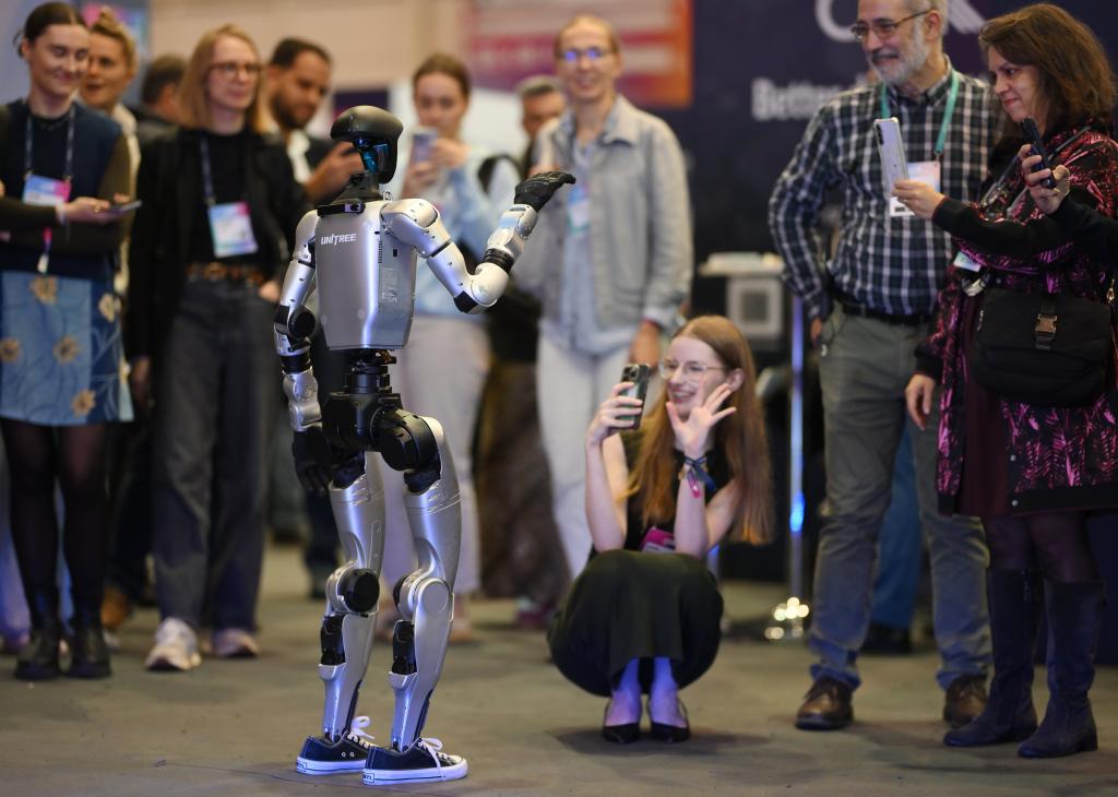2025年11月12日,在葡萄牙里斯本,中國(guó)企業(yè)宇樹(shù)科技的人形機(jī)器人和與會(huì)者在2025年網(wǎng)絡(luò)峰會(huì)現(xiàn)場(chǎng)互動(dòng)。新華社發(fā)