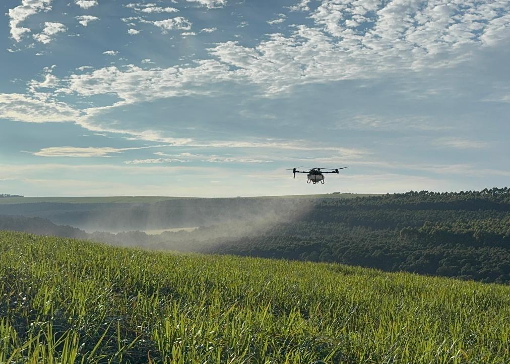 2025年3月25日,在南非夸祖魯-納塔爾省的方廷希爾莊園,中國(guó)農(nóng)用無(wú)人機(jī)為甘蔗林噴灑殺菌劑。新華社記者 白舸 攝