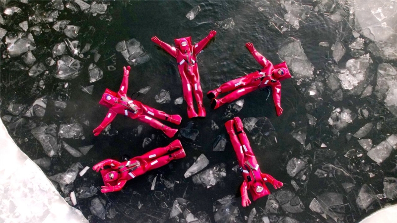 12月5日,在阿勒泰市阿葦灘鎮(zhèn),不少游客身著紅色特制防寒服,在阿勒泰冰浮俱樂部體驗(yàn)冰浮項(xiàng)目。張福新攝