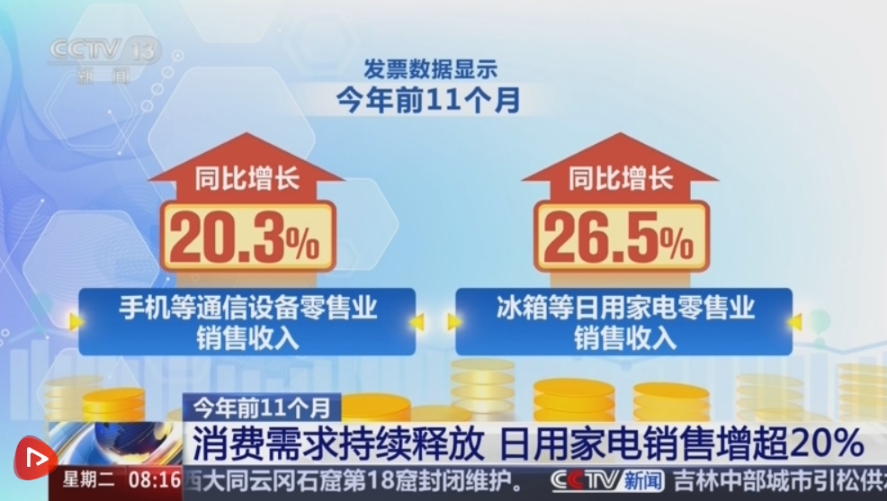 發(fā)票數(shù)據(jù)顯示,2025年前11個月,手機(jī)等通信設(shè)備零售業(yè)、冰箱等日用家電零售業(yè)銷售收入同比分別增長20.3%、26.5%。新能源汽車消費(fèi)也持續(xù)向好,新能源乘用車銷售收入同比增長19.1%。同時,文旅市場新業(yè)態(tài)新場景不斷涌現(xiàn),激發(fā)消費(fèi)活力持續(xù)增強(qiáng)。