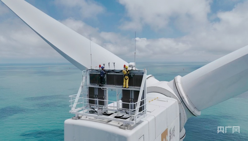 工作人員在風機頂部開展檢修工作(央廣網(wǎng)發(fā) 受訪者供圖)