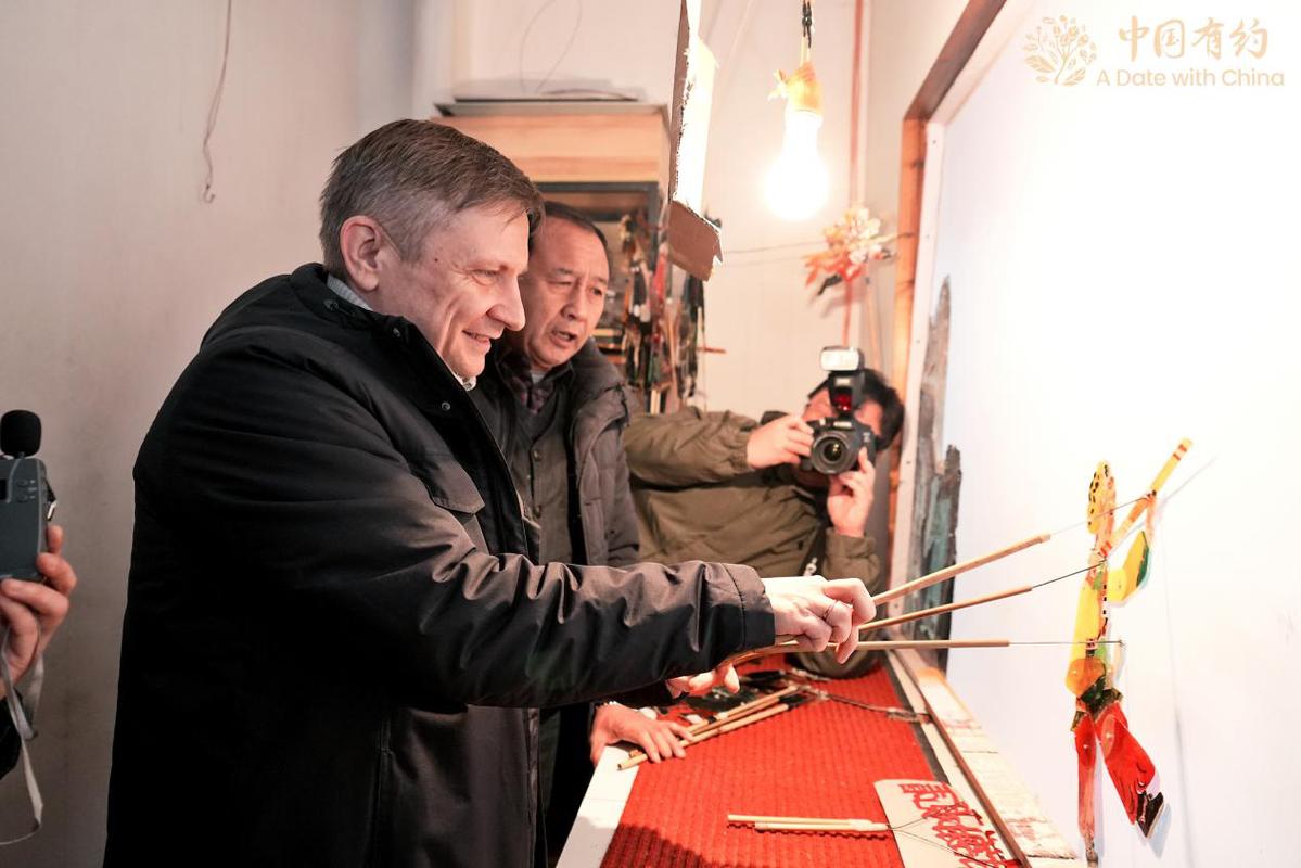 外國(guó)朋友體驗(yàn)皮影戲表演。