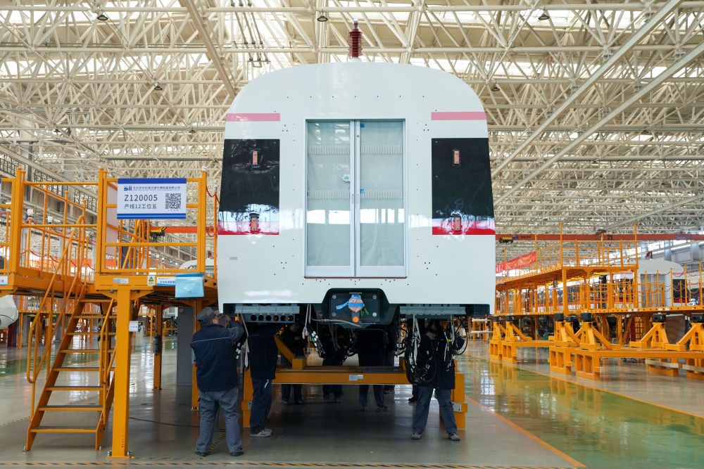 在京投裝備河北京車智能制造基地,工作人員在地鐵列車總裝車間內(nèi)工作(2025年2月14日攝)。京投裝備河北京車智能制造基地位于河北省保定市,采用“北京研發(fā)+河北制造” 模式運(yùn)營(yíng),是貫徹京津冀協(xié)同發(fā)展戰(zhàn)略的重要項(xiàng)目。新華社記者 鞠煥宗 攝