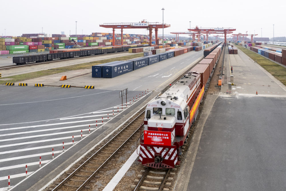 2025年12月5日拍攝的上海鐵路蘆潮港集裝箱中心站(無人機(jī)照片)。當(dāng)日上午,一趟載有太陽能光伏組件、汽車零配件等貨物的海鐵聯(lián)運(yùn)班列緩緩從上海蘆潮港集裝箱中心站開出,上海海鐵聯(lián)運(yùn)年度業(yè)務(wù)量首次跨越百萬標(biāo)箱大關(guān)。新華社記者 王翔 攝