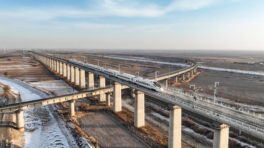 12月14日,一列試驗(yàn)列車行駛在包銀高鐵線路上(無(wú)人機(jī)照片)。新華社發(fā)