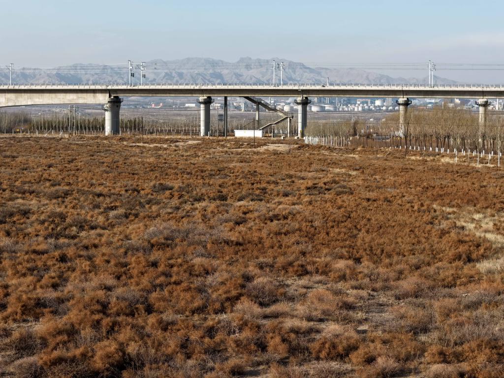 這是12月11日拍攝的包銀高鐵二道坎跨京藏高速特大橋,橋下是內(nèi)蒙古西鄂爾多斯國(guó)家級(jí)自然保護(hù)區(qū)烏海片區(qū)(無(wú)人機(jī)照片)。新華社記者 李志鵬 攝