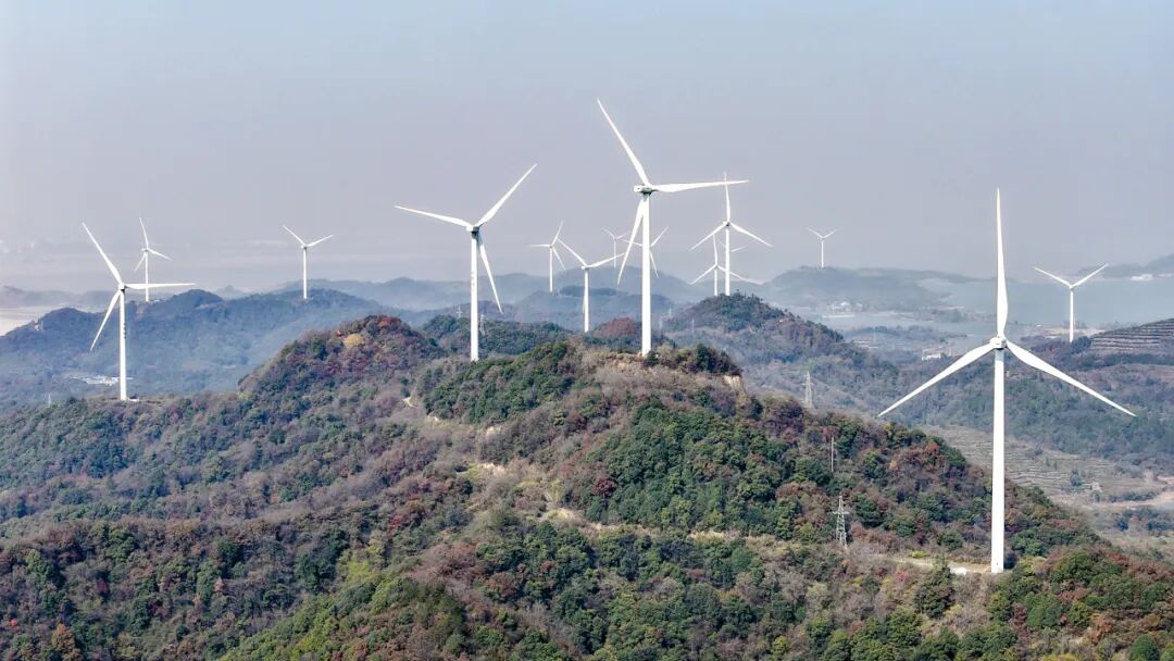 12月3日,在江西九江市湖口縣舜德鄉(xiāng)高橋村,風(fēng)力發(fā)電機組矗立青山間,不斷輸送綠色清潔能源。張玉攝