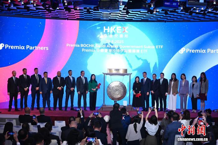 2025年5月29日,香港交易及結(jié)算所有限公司與沙特阿拉伯證券交易所集團(tuán)在香港合辦“香港——沙特資本市場論壇”。現(xiàn)場亦舉行Premia中銀香港沙特伊斯蘭國債交易所買賣基金(ETF)在香港上市的敲鑼儀式。圖為香港特區(qū)政府財(cái)政司司長陳茂波(右七)等嘉賓出席敲鑼儀式。 中新社記者 李志華 攝