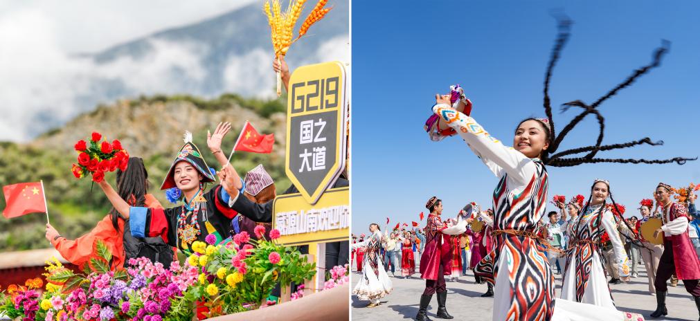 左圖:2025年8月21日上午,彩車上的演員通過西藏拉薩市布達(dá)拉宮廣場(chǎng)時(shí)向人群揮手,熱烈慶祝西藏自治區(qū)成立60周年。右圖:2025年9月23日下午,群眾載歌載舞,喜迎新疆維吾爾自治區(qū)成立70周年。新華社記者 丁增尼達(dá) 畢曉洋 攝