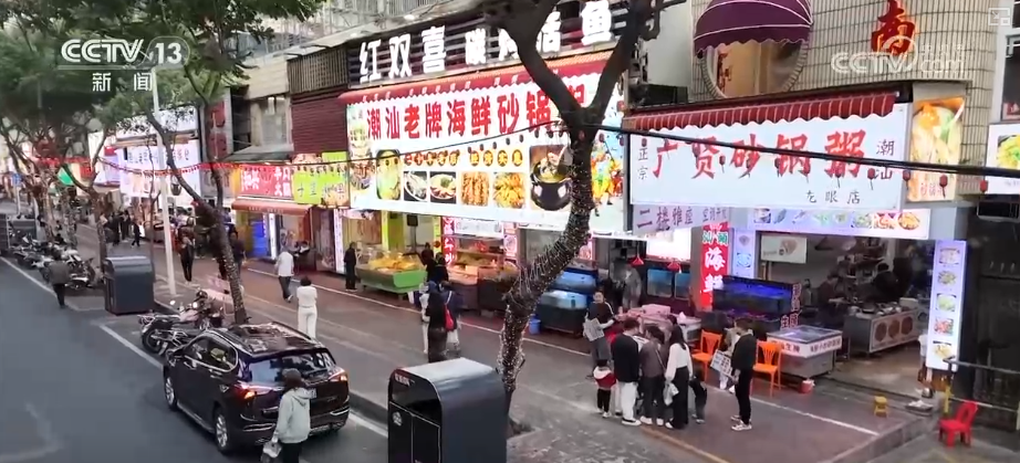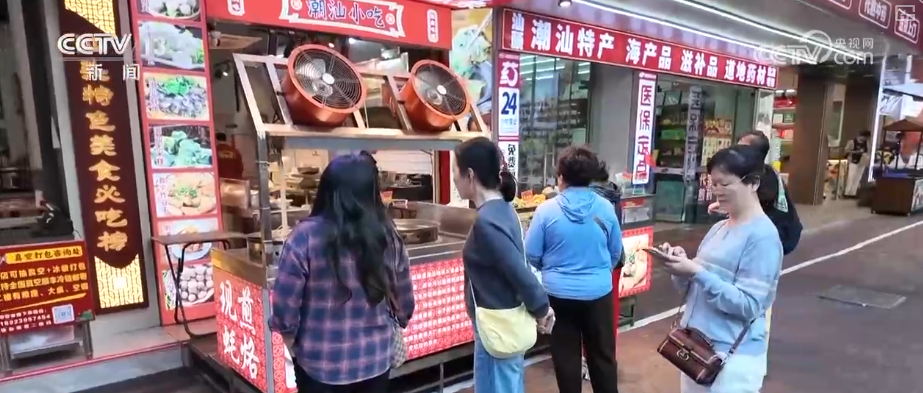 第一站來到汕頭著名的美食集聚地龍眼南路美食街,這里全長(zhǎng)470米,涵蓋潮汕特色美食、茶飲甜品、創(chuàng)意餐飲等。游客不僅可以吃上腸粉、粿條湯等傳統(tǒng)早餐,還能品嘗鹵鵝、生腌等招牌菜肴,以及反沙芋頭、腐乳雞翅等特色小吃。這條24小時(shí)不打烊的美食街吸引了來自全國(guó)各地的游客。