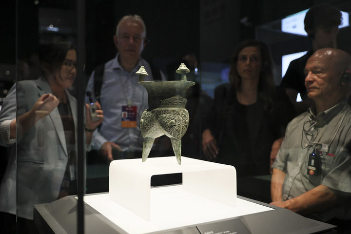 2025年10月13日,第二屆世界中國學大會“中國式現(xiàn)代化”主題參訪活動嘉賓在上海博物館東館青銅館參觀。新華社記者 王翔 攝