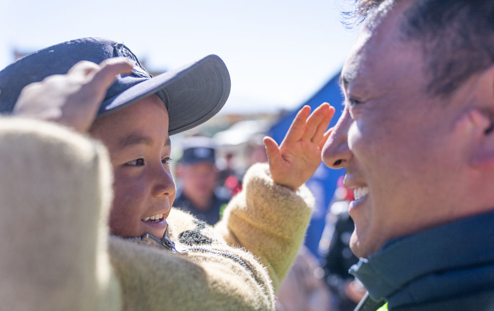 2025年1月14日,在受到地震波及的西藏定日縣長所鄉(xiāng)嘎布村,一名小朋友戴上了參加抗震救災工作的移民警察米瑪次仁的帽子,向他敬禮。新華社記者 丁增尼達 攝
